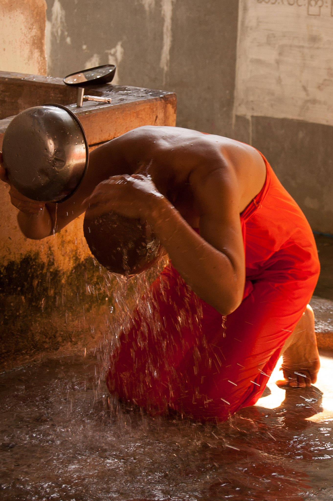 Πιο δεξιά κάποια μοναχή κάνει το μπάνιο της και ξυρίζει το κεφάλι της.