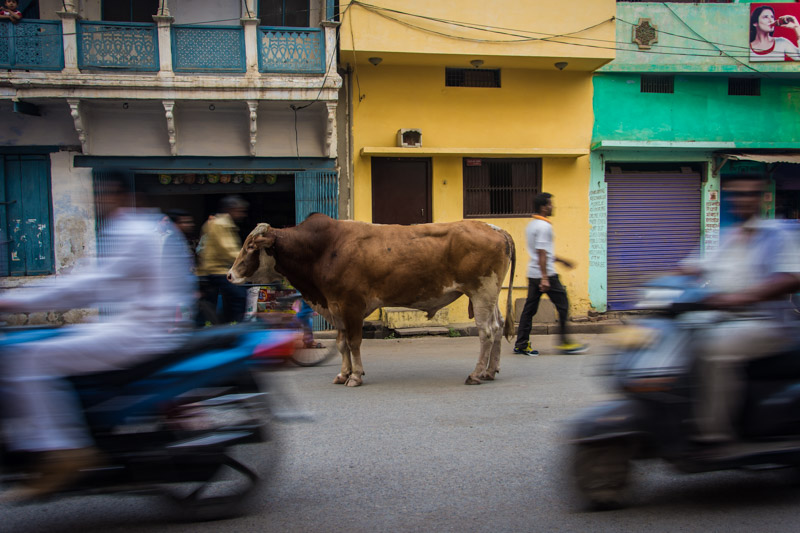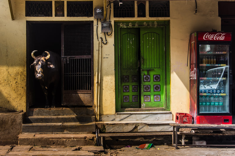Varanasi towards the Ganges River, you see old and poor houses and some cows