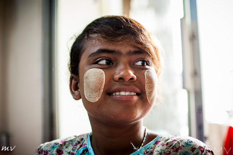 #Fact10: Thanaka. I love it! It is white patterns on their face. It is the traditional Thanaka, one tree powder spread on their faces and in several shapes and patterns mainly circles. Something like makeup. Almost all the children and women and some men use that. It is a symbol of traditional beauty and it is considered good for the skin.
